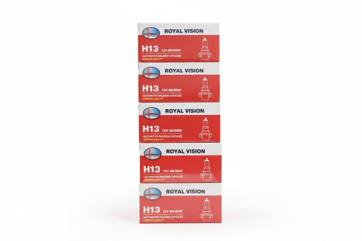 This listing is for a 5-pack of Royal Vision H13 Automotive Halogen Capsules, offering reliable illumination for your vehicle. These bulbs are designed to meet standard specifications and provide a clear, quality light output, promoting better visibility during nighttime driving. They are a practical choice for replacing worn-out or broken headlight bulbs.