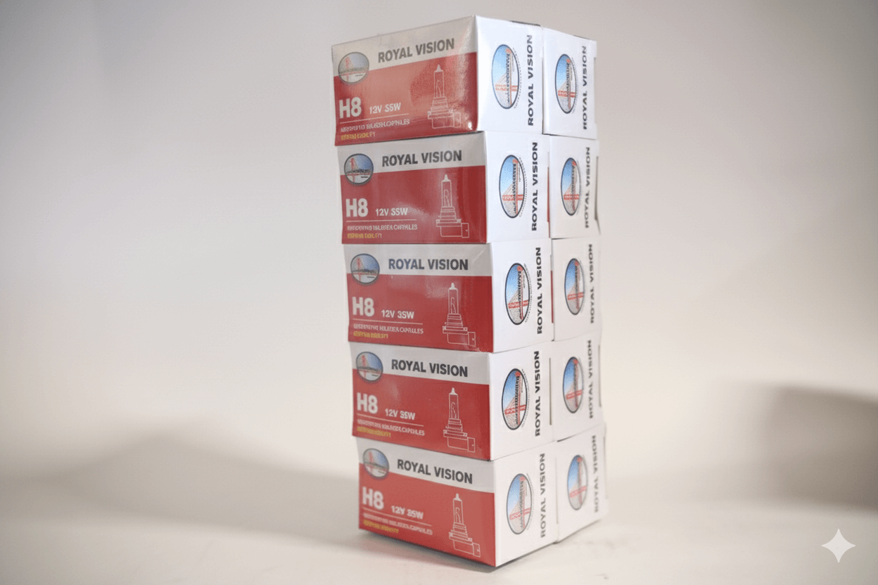 This listing offers a 5-pack of ROYAL VISION H8 12V 35W halogen light bulbs. These bulbs are commonly used for fog lights, daytime running lights (DRL), or sometimes as low beam headlights in many modern vehicles.