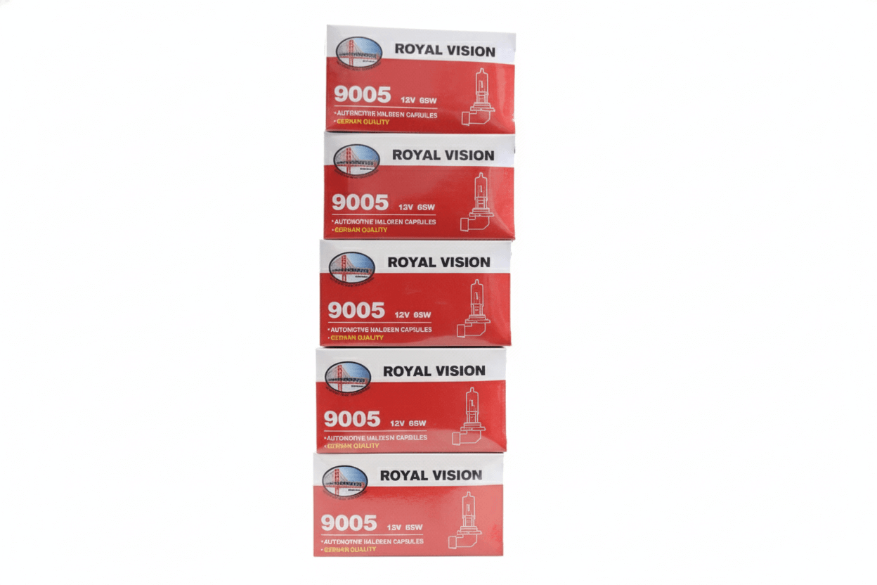 This listing is for a 5-pack of Royal Vision brand high-quality Automotive Halogen Headlight Capsules (bulbs). The 9005 type is typically used for high beam, low beam, or fog light applications, depending on the vehicle model. These bulbs are sold in their original retail packaging.
