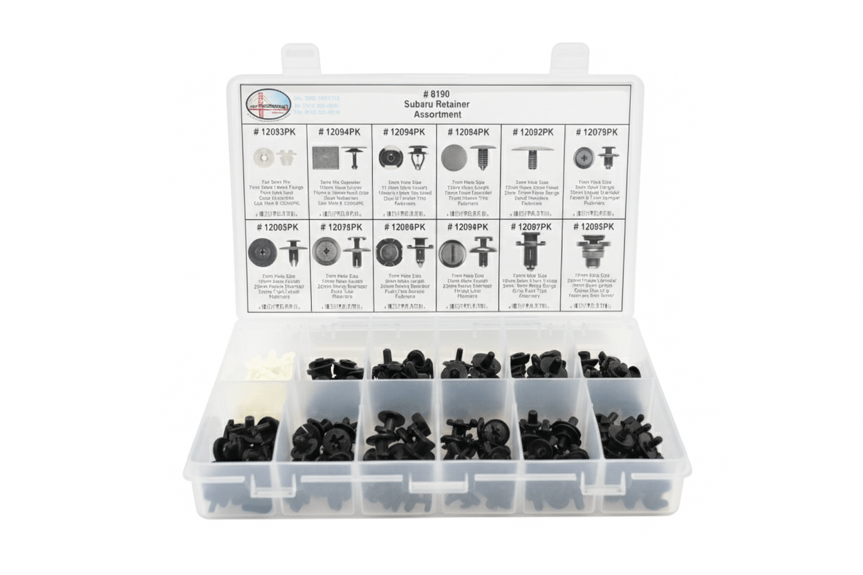 This Car-Go Automotive Subaru Retainer Assortment (#8190) is a comprehensive kit containing a variety of plastic push-type clips and fasteners specifically selected for compatibility with Subaru vehicles. This set is essential for performing body work, replacing damaged clips during maintenance, or re-securing interior and exterior trim. The kit includes 12 different types of popular retainers, ensuring you have the correct fastener for most applications, including bumpers, fender liners, trunk trim, and weather stripping.