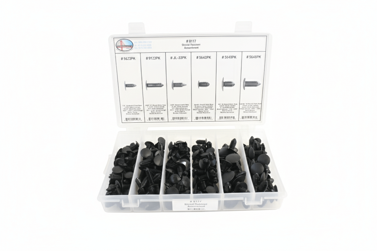 This is a versatile Shield Retainer Assortment (#8117) kit containing various black nylon push-type retainers used for securing vehicle shields, panels, and trim. This assortment provides six different sizes/styles of fasteners for a wide range of common automotive applications in body work, repair, and maintenance.